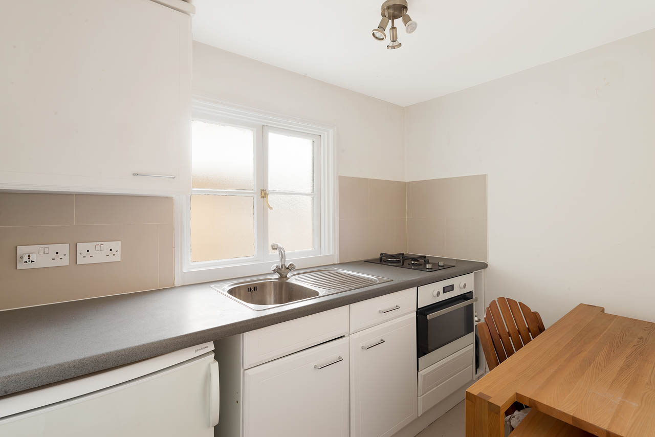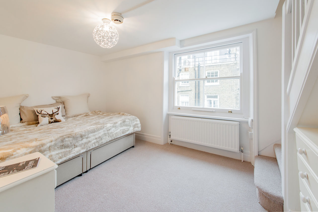 An unusual Duplex Studio apartment on a peaceful side of this Garden Oval just off the Gloucester Road behind Cornwall gardens. Situated on the top of a period building. The first level has the studio room with double bed and storage and there are stairs up the the upper level that comprises a smart shower room and separate kitchen. There is also a separate store room with a washing machine.