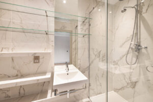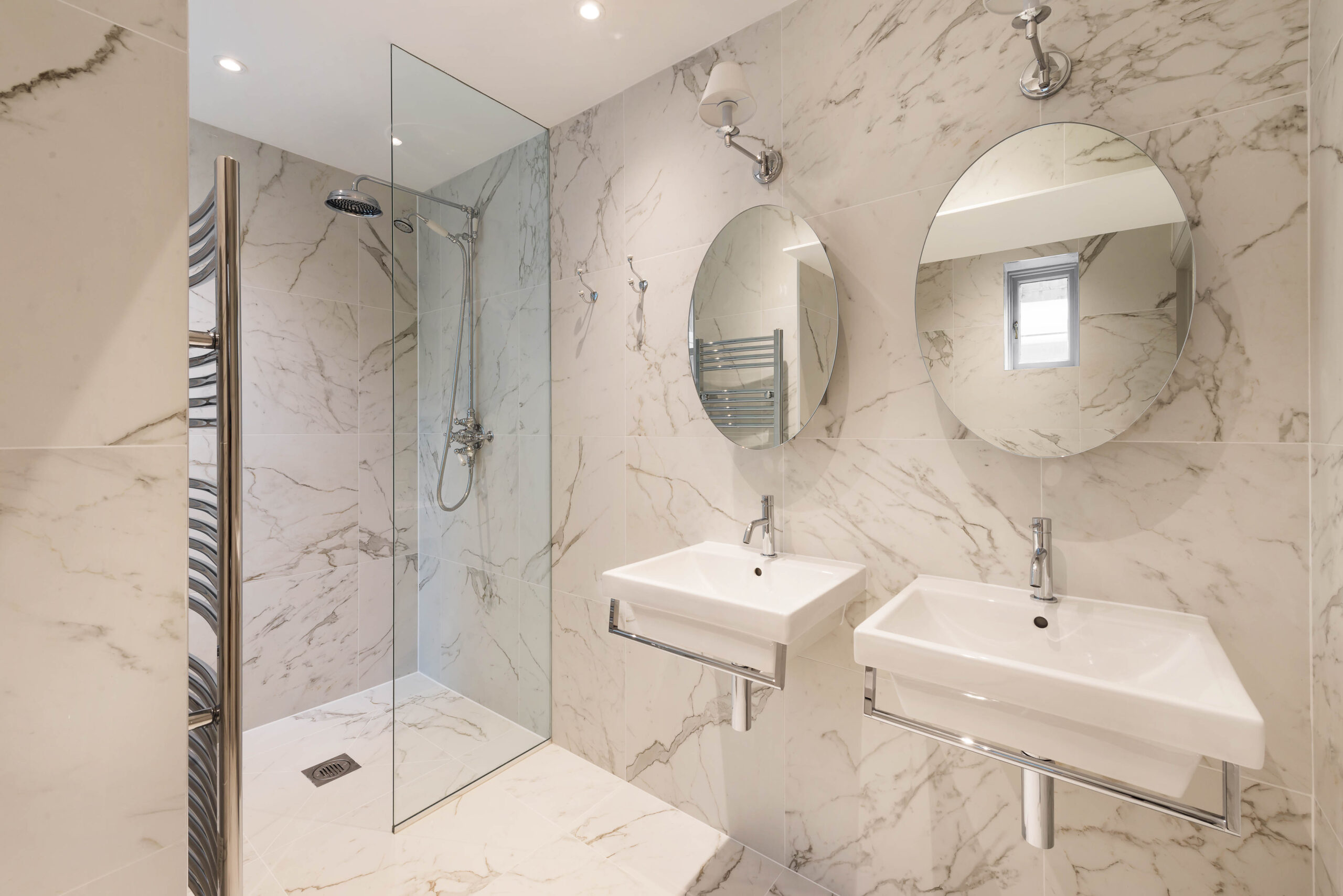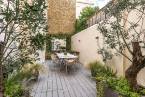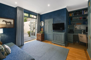 Entering the 27ft x17ft Drawing Room you are struck by the splendid volume with its 12ft  ceiling height, restored parquet floor, original shutters and proportions to bring a smile to old Italian mathematicians. A formal dining room adjoins and could be added to the living space as there is a fully fitted eat-in kitchen with top quality machinery down the hall. A guest cloakroom and coat cupboard completes the ground level. Downstairs provides THREE good sized bedrooms: the Master with en-suite marble wet room shower opens onto a private patio, the second bedroom with new shower room also opens onto the patio and has a workstation area and converts easily into a study, and the third enjoys a full bathroom  Excellent storage throughout. The Building benefits from a resident caretaker.